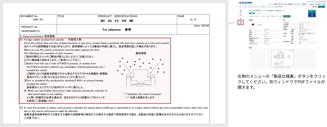 異物の侵入する可能性の高い環境下でのご使用が想定される場合は、当社防塵タイプのタクトスイッチ® の採用をご検討ください。