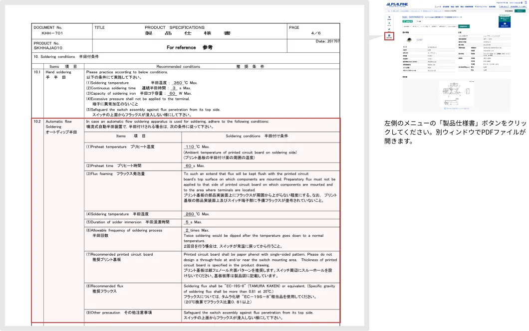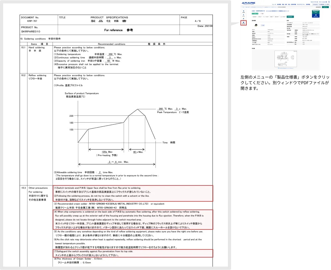 クリーム半田内のフラックスが、リフロー工程にてタクトスイッチ® に入り込む場合があります。製品仕様書に記載の半田付けに関する注意事項をご確認の上実装をお願いします。
