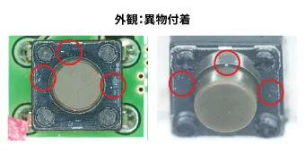 タクトスイッチ® のステム、フレーム、ハウジングなどの隙間から異物が内部に入り込む可能性があり、これが可動部の摺動を妨げると感触不具合を起こす原因になります。更に、防塵タイプでないタクトスイッチ® では、その異物が接点にまで到達した場合、それが絶縁物であればONしない、導体であればOFFしない導通不具合の原因になります。