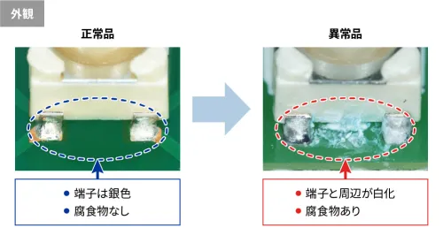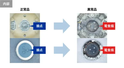 防水タイプでないタクトスイッチ® では、タクトスイッチ® 内部に水、溶剤、フラックス、コーティング剤等が浸入すると接点が腐食(電食)して、ON/OFFしない原因になります。