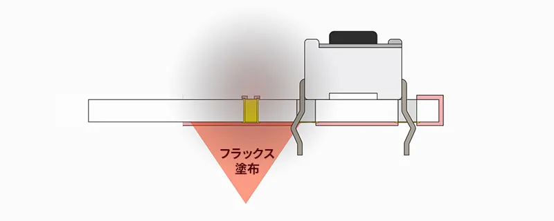 半田前に塗布したフラックスがスルーホール等を通ってタクトスイッチ® に浸入する場合があります。タクトスイッチ® の取付穴寸法を遵守頂き、また、スイッチの取付以外のスルーホールや基板端面からはスイッチを離したレイアウトにしてください。その他、製品仕様書のオートディップ半田の条件をお守りください。