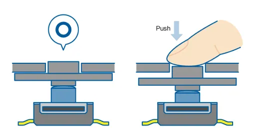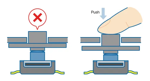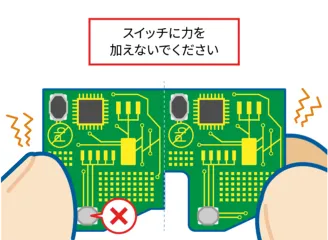 タクトスイッチ® は、強い力での操作や落下などの衝撃荷重が加わると、ON/OFF不良、感触の不具合の原因となります。