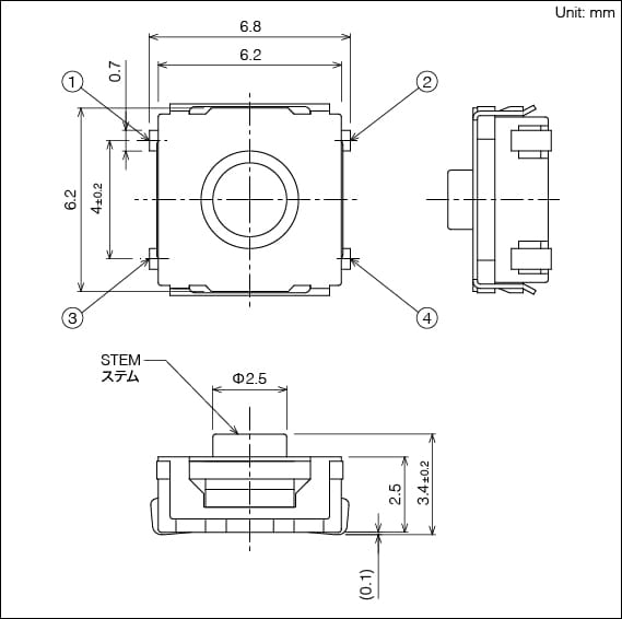 - カーボン接点の場合、押圧荷重により接触抵抗が変化する特性があります。電圧分圧回路などに使用する際は十分にご確認の上、ご使用ください。