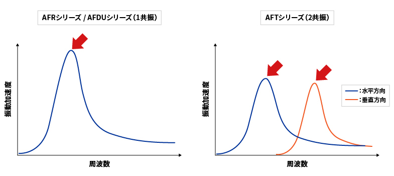 AFRシリーズ / AFDUシリーズは1つの山となる一方で、AFTシリーズは2共振タイプのため2山となります。
