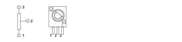 可変抵抗器の端子番号を表す場合、抵抗素子の両終端に接続した端子をそれぞれ1端子、3端子といいます。また、しゅう動接点に接続した端子を2端子といいます。
