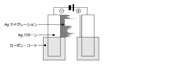 高温高湿中で長時間使用される場合に、抵抗体基板に付着した水分が水層を形成して銀がプラス極からマイナス極へ移動する現象をいい、絶縁抵抗の低下またはショートといった問題を起こします。対策としては電極間隔を広げることや銀にカーボンコートを行う等があります。