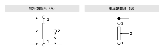 電流調整形回路(図B)は、抵抗体としゅう動子間の接触抵抗の影響を受けますので、ご使用をお避けください。