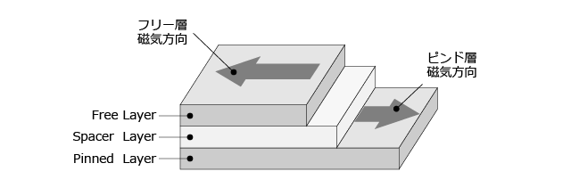 ピンド層に対するフリー層の角度で抵抗値が変化し、同じときに抵抗値が最小、逆のとき抵抗値が最大になる性質を利用しています。