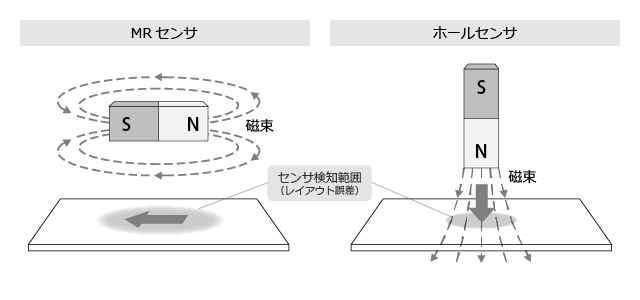 検出磁界の向きが異なります。それぞれの部品を表面実装した場合、ホールセンサーが実装面に垂直な磁界を検出するのに対しMRセンサーは水平な磁界を検出します。したがって磁石とセンサーの位置関係も変わります。