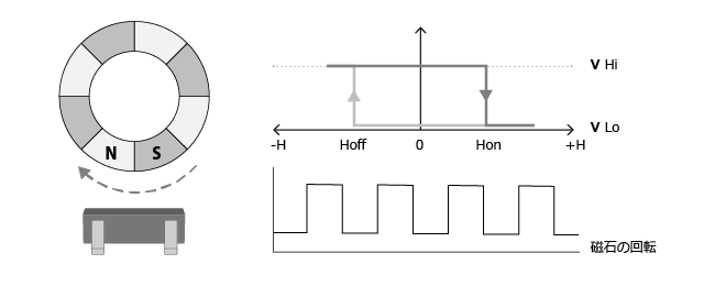 磁界の強さによってON状態かOFF状態を出力する磁気センサーをスイッチング出力と呼んでいます。