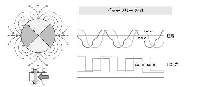 一般的なエンコーダは磁石の着磁ピッチとセンサーピッチを揃える必要がありますが、ピッチフリーは着磁ピッチに依存しない製品のことです。