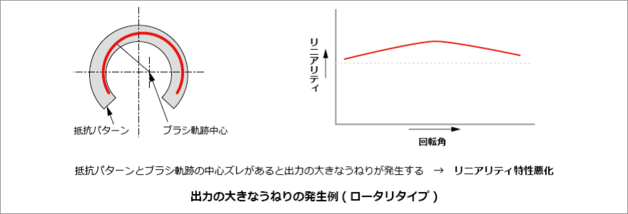 出力の大きなうねりは、抵抗パターンの膜厚のバラツキと位置ズレにより発生し、ロータリータイプの場合は抵抗パターンとブラシの中心軸間の位置ズレからも発生します。