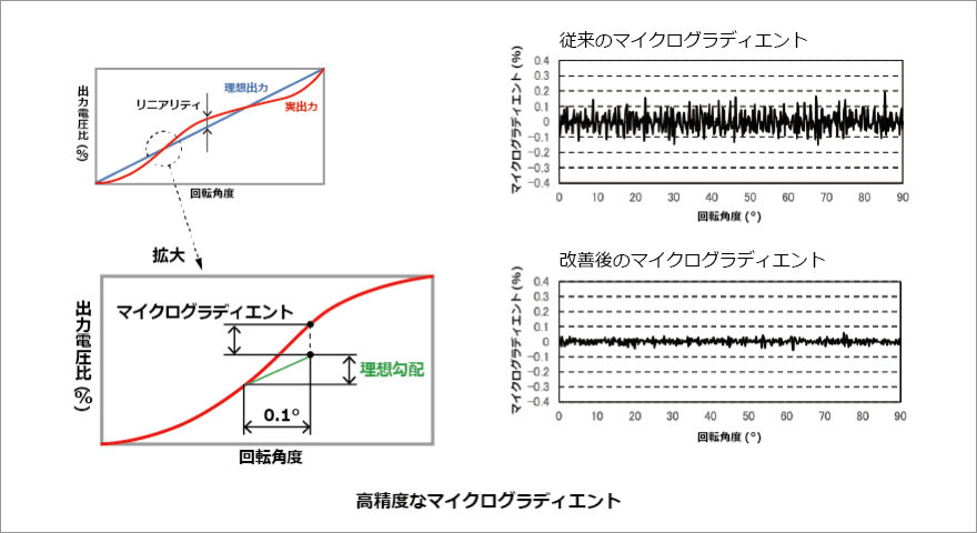 抵抗式ポジションセンサーのリニアリティ特性は出力の「大きなうねり」と「細かい変化(マイクログラディエント)」で構成され、 それぞれの発生要因を改善することでリニアリティ特性を向上することができます。
