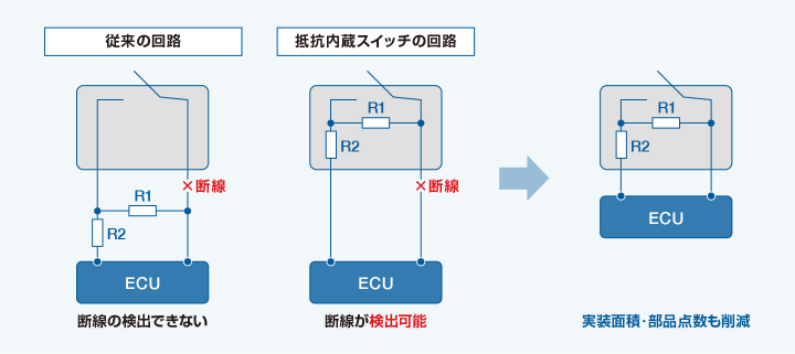 スイッチは電気回路のオープン、クローズを切り替えるものです。しかし、回路に断線(または短絡)する故障が発生した場合、それが断線(または短絡)なのか、スイッチがオープン(またはクローズ)に切り替わったのか判別がつきません。そのため、クルマなど安全性を重視する用途では、回路に抵抗を組み込んで出力電圧を変え、ECUでスイッチによるものなのか、断線(または短絡)によるものなのか判別する方法をとっています。