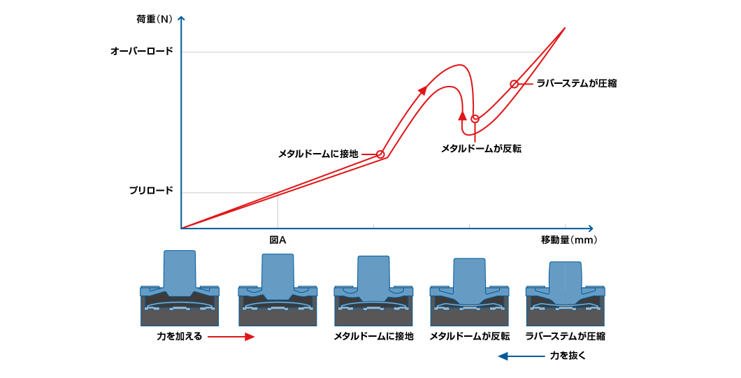 タクトスイッチ® のバラエティには、ストロークがおおよそ0.4~0.9mmのミドルストロークタイプがあります。その特長は、ステムに弾性のあるラバー材を使用することで、可動接点を押す前のプリロードと、可動接点を押し切った後のオーバーロードがあることです(下図)。この力加減によって押したときの押し心地(フィーリング)を作っています。