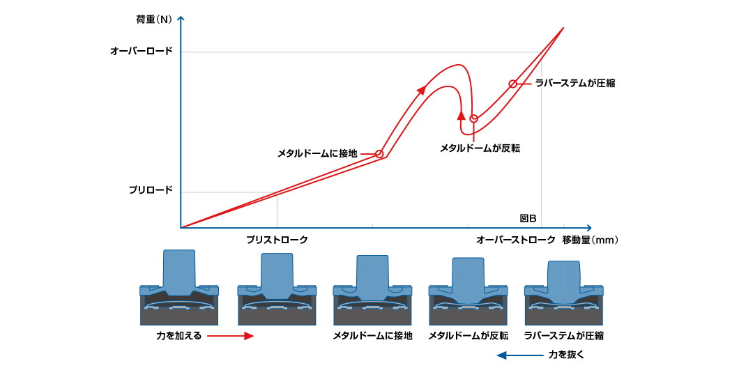 タクトスイッチ® のバラエティには、ストロークがおおよそ0.4~0.9mmのミドルストロークタイプがあります。その特長は、ステムに弾性のあるラバー材を使用することで、可動接点を押す前のプリストロークと、可動接点を押し切った後のオーバーストロークがあることです(下図)。このストロークによって押したときの押し心地(フィーリング)を作っています。