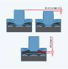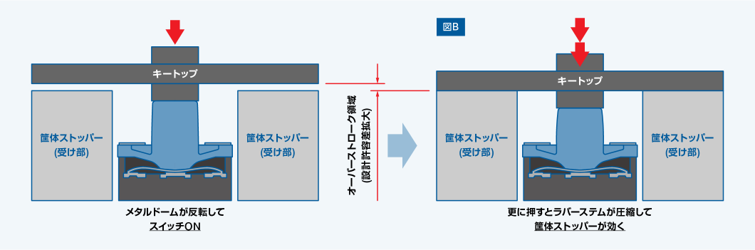 オーバーストローク領域を使って、タクトスイッチ® のストッパーの筐体設計の許容差を拡げることができる。