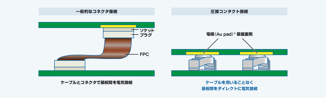 従来の基板対基板の接続には、コネクタとケーブルで接続することが一般的であり、部品点数やスペースが必要になる等の課題があった。