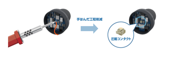 コネクタの嵌合工程、手はんだ工程の削減により組立性の改善ができる。