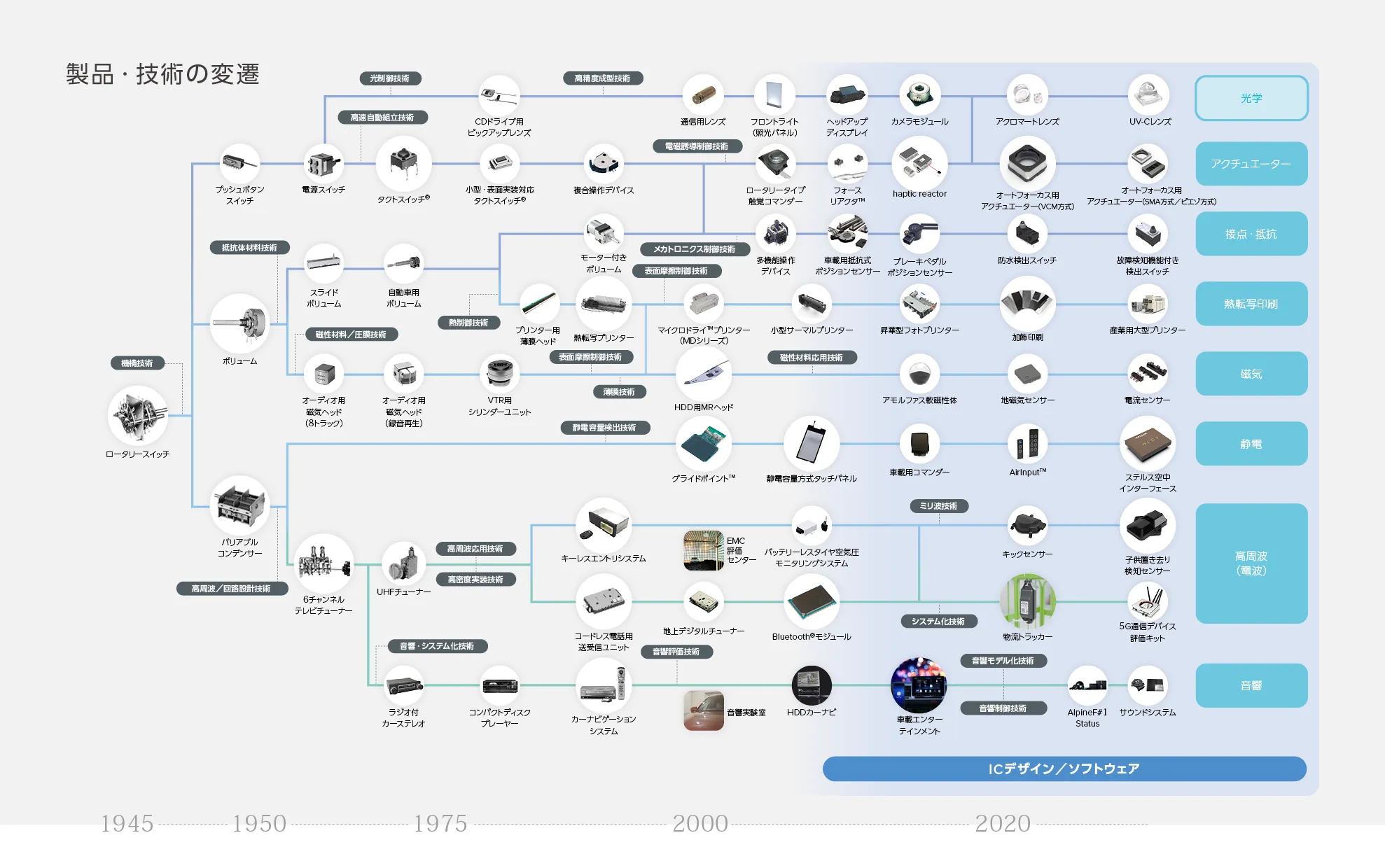 アルプスアルパインの技術の原点は、「ロータリースイッチ」で培われた、機器の動きや構造を設計する機構技術です。