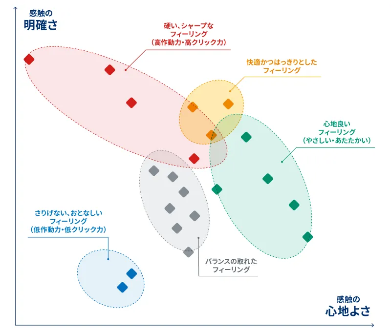 タクトスイッチ®にはドーム状の金属のバネが入っており、このバネの厚さを変えることによりフィーリングを変えています。しかし、根拠なく厚さを決めることはできないため、感性語から落とし込んだ物理量を用いて厚さのバリエーションを作っています。