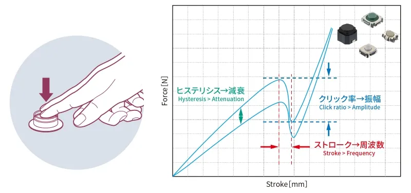 アルプスアルパインの主力製品であるタクトスイッチ®はF-Sカーブによる分析を活用して開発しています。タクトスイッチ®は自動車の各種スイッチに用いられているもので、用途によって押し心地のバリエーションが必要です。例えばエアコンの温度調整ボタンなど頻繁に操作するもの、仮に意図しない操作が行われても危険性が低いなら軽いタッチが良いです。しかし、前走車に追従するオートクルーズコントロールなど意図せず作動すると危険なスイッチはやや重いタッチが求められます。