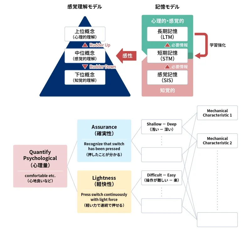 最も高い層にあるのが「心理」で、これは高級感など感性語そのものです。次の層が「感覚」で、明瞭感や軽快感といったより具体的な感覚になります。そして最下層が「物理」で作動力やクリック距離と定量的に表現できるようになります。