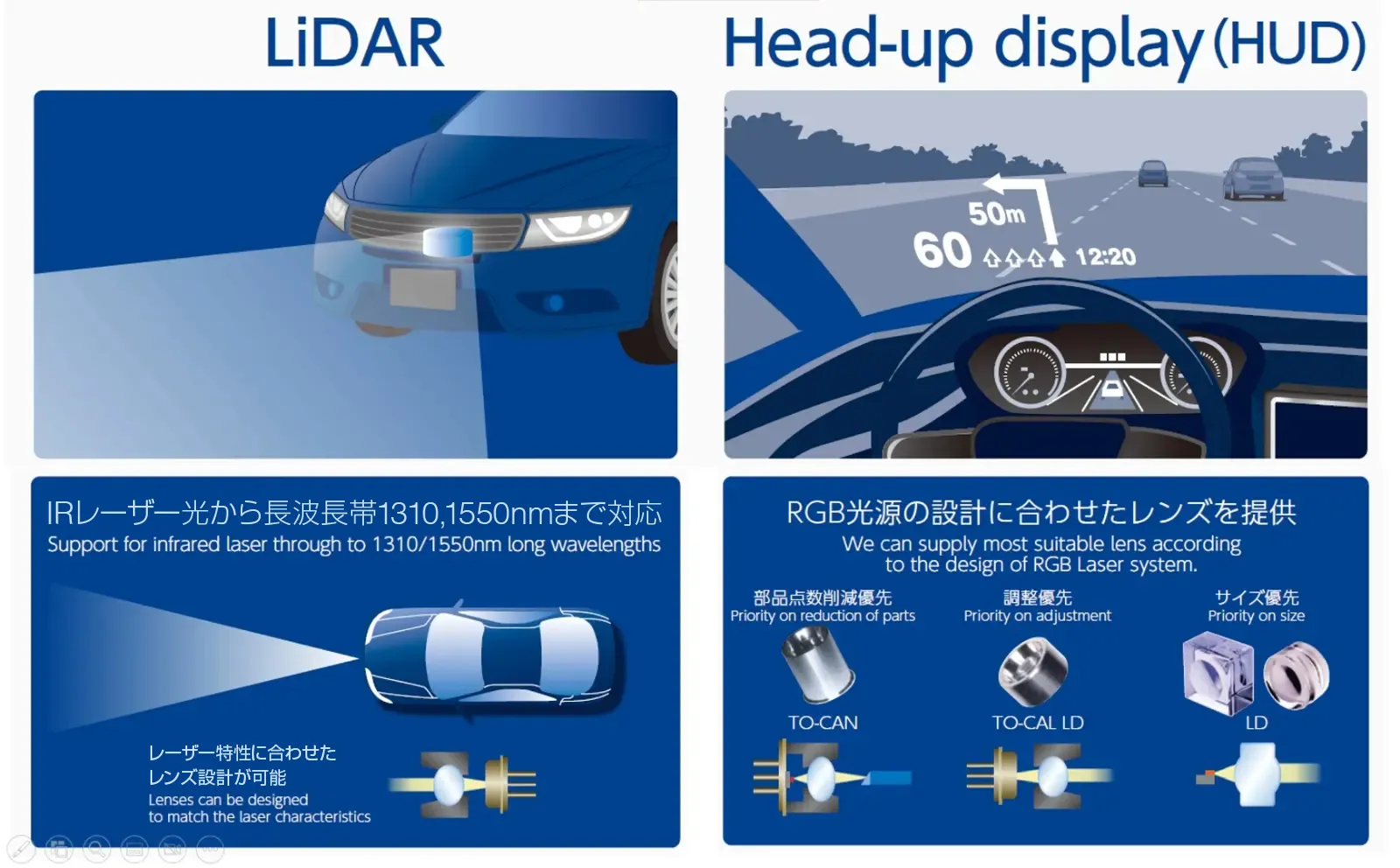 FACレンズの活用例となるのが、自動運転技術においてレーザーを照射して、その反射光の情報をもとに対象物までの距離や対象物の形などを計測する「LiDAR」です。その他、人間の視野の中に、周囲の光景に溶け込むよう重ね合わせて情報を投影させる「HUD」用のレンズや、金属加工用レーザー機器など、広く利用されています。