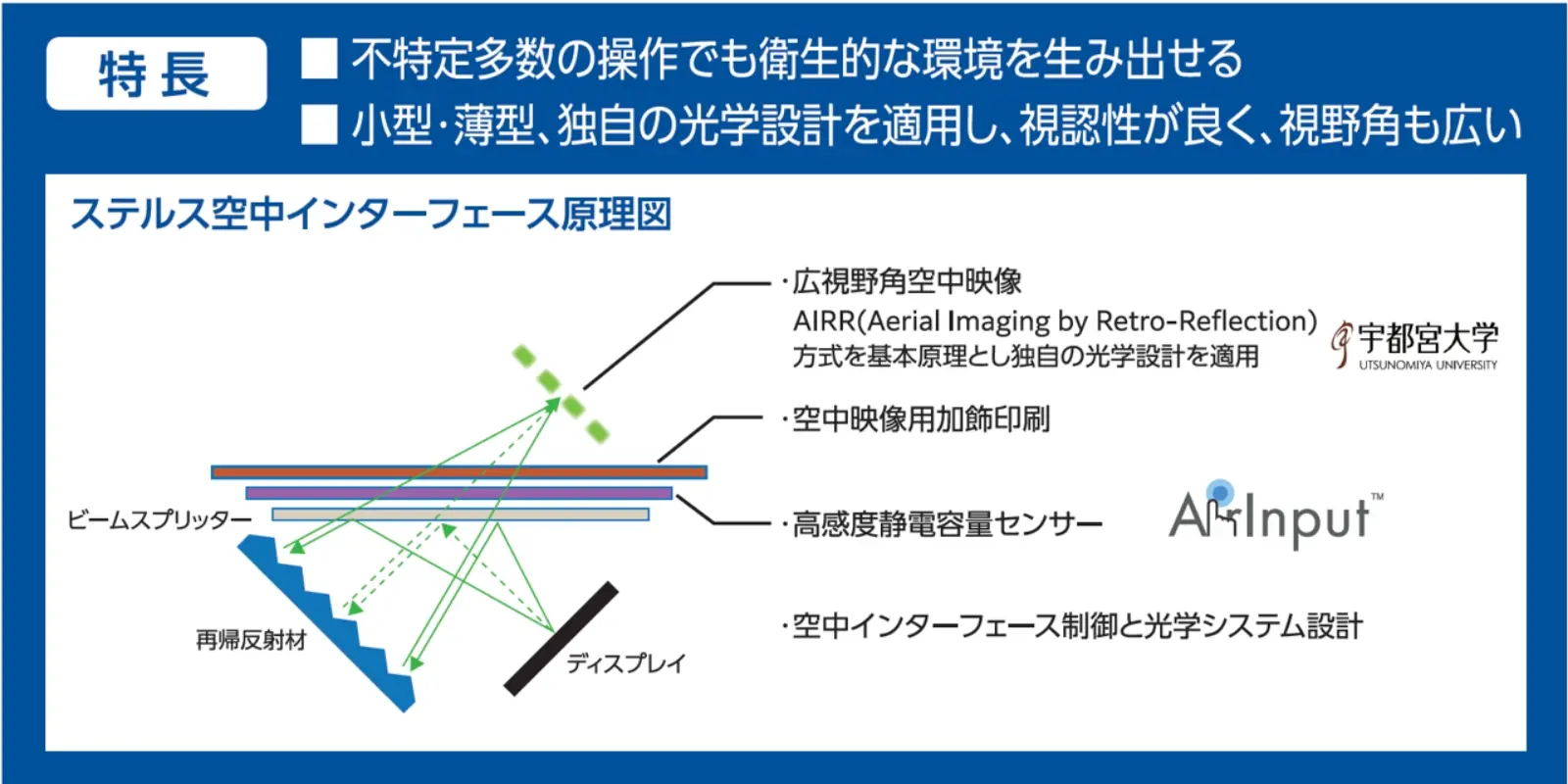 さらに、ステルス空中インターフェースには静電技術と熱転写加飾技術が活用されています。それぞれアルプスアルパインが持つコア技術を結集して生み出した次世代のインターフェースとなっています。