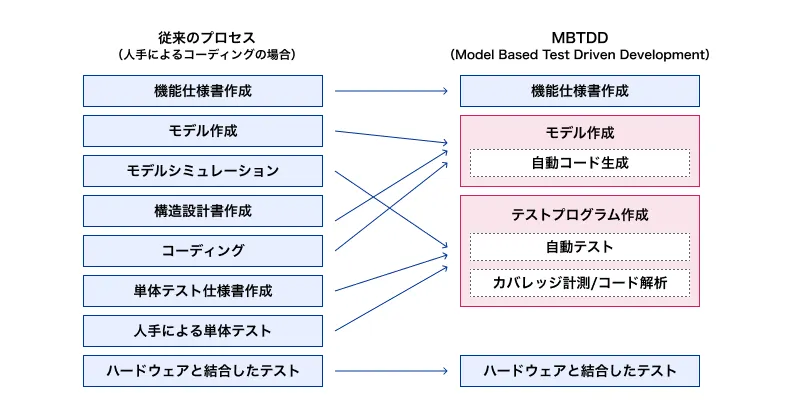 これはモデルベース開発とテスト駆動開発を組み合わせたもので、エンジニアはコンピューター上のモデリングツールを使って視覚的にソフトウェアの設計を行います。同様に単体テストのシナリオおよびテストを実行するフレームワークもモデルを使って作成します。モデルからプログラムコードへの変換はツールが行うため、従来の人手によるコーディングは不要となり、空いた時間をモデルの設計に専念することができます。またテストを含むプログラムコードはコンピューターが自動で実行するため、人手を介さずいつでも何度でも評価を行うことが可能となります。このようにクリエイティブな部分は人が行い、作業的な部分はコンピューターが行うことによって、開発効率の向上と品質の向上を両立します。