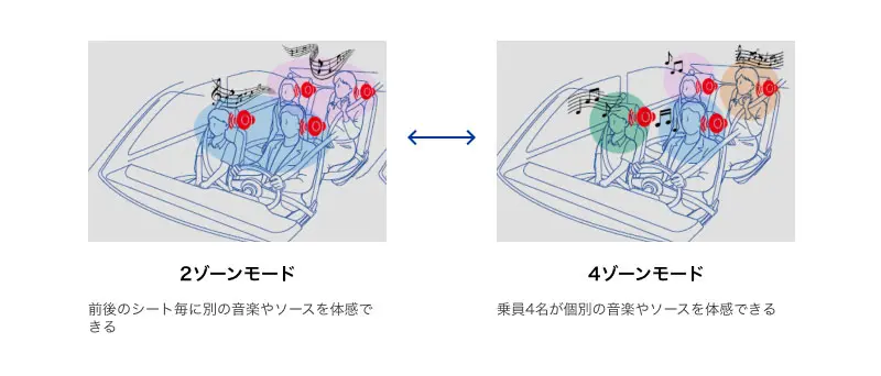自動運転の領域ではキャビンモニタリングを推進。カメラやセンサーを駆使してドライバーと乗員をモニターし、乗車時から通常走行・自動運転走行時までの安全性や快適性を高めるソリューションです。また、完全自動運転が実現すると、移動中の過ごし方が大きく変わります。ゾーン別サウンドは前席・後席の2ゾーン、または運転席・助手席・後席左右の4ゾーンで異なる音場を作り出すシステム。たとえば運転席ではスポーツ観戦、助手席では映画、後席はゲームというように、他の音に影響されず好きなエンターテインメントを楽しむことができます。