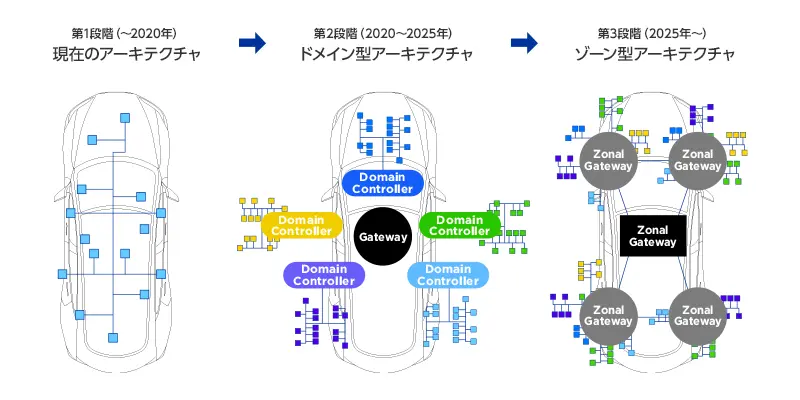 また、現在の車は電子制御システムごとに合計100~200個ものECU(Electronic Control Unit)が搭載されており、構造の煩雑さを解消するために自動車メーカー各社はECUの統合化を模索。ドメイン型アーキテクチャ、ゾーン型アーキテクチャといった統合化が模索されています。